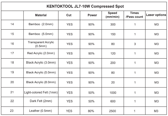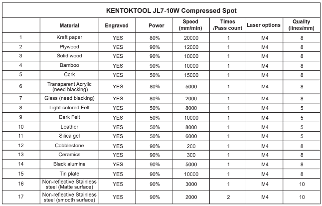 Common materials and recommended engraving parameters for 10W output laser