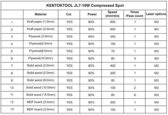 Common materials and recommended cutting parameters for 10W output laser